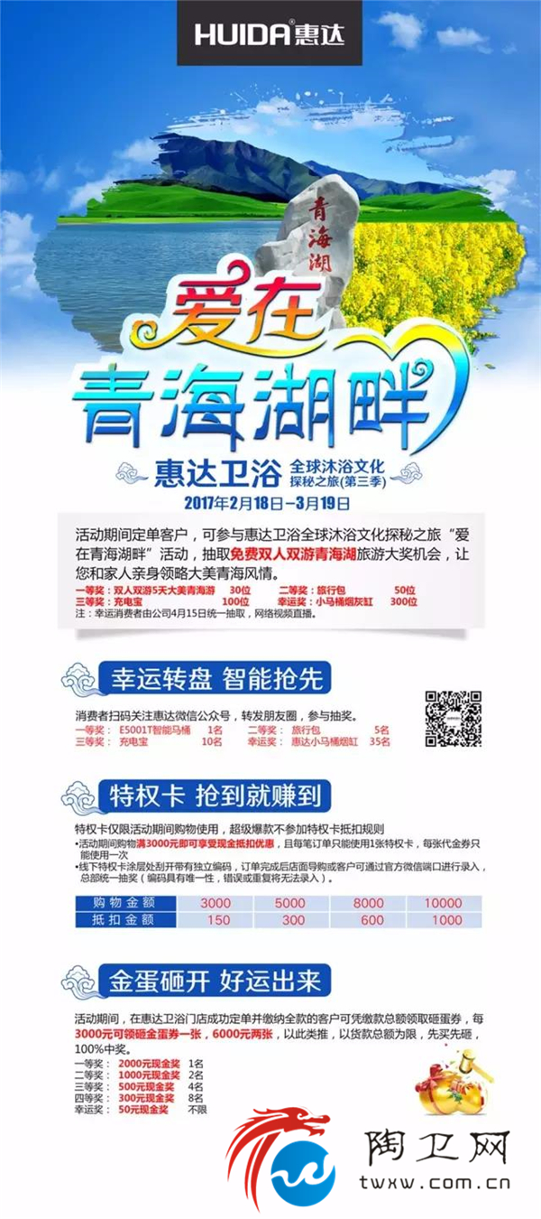 2017年,在3.15来临之际,惠达卫浴再一次震撼推出了一场不可复制的营销盛典“爱在青海湖畔”暨惠达卫浴全球沐浴文化探秘之旅(Ⅲ)。2月18日,惠达卫浴全球沐浴文化探秘之旅(Ⅲ)——“爱在青海湖畔”在全国各地全面启动。惠达卫浴全国门店及天猫旗舰店,全国线上线下同步开启青海湖畔“浴”见幸福大行动。带领第三季幸运体验者前往青海湖畔,“浴”见幸福。