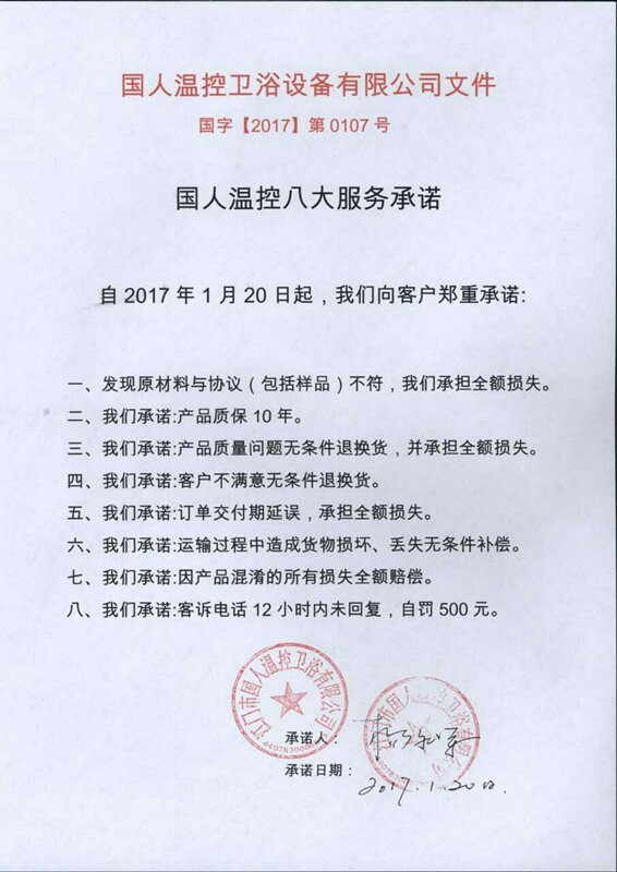 据了解,除了保障产品品质,提升产品科技创新外,国人温控在客户服务体系上也下足功夫。在发布会现场,李九江重申了国人温控的八大服务承诺,并将在2017年下半年启动选择品牌商开展针对性客户市场调研,拿出系统设计方案,以更好的服务客户。