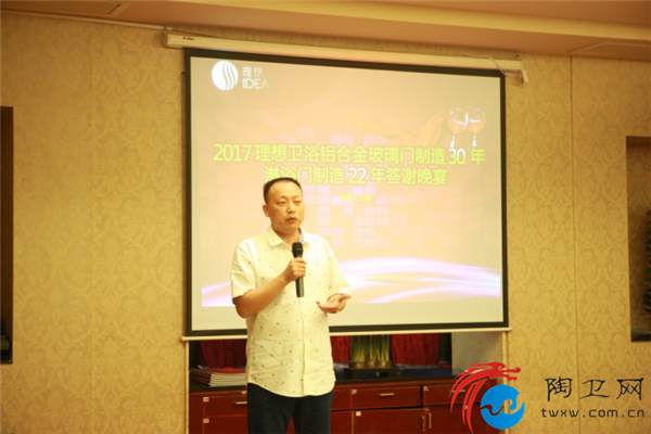 在晚宴现场,理想卫浴董事长危五祥发表了精彩致辞,向莅临现场的所有嘉宾表示了热烈欢迎。危总表示,回顾理想卫浴走过的22年风雨历程,凝聚了每一位理想人和合作伙伴的激情和汗水,未来将继续发扬勤劳、正直、敬业、创新的精神,把理想卫浴打造成为世界一流的现代化淋浴房生产企业。