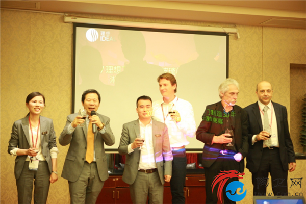 理想卫浴董事长危五祥带领三位欧洲设计师及国内销售经理上台祝酒