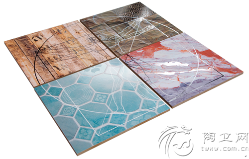 (图为应用Xaar 1002 GS40喷印头印制的亚光、亮光、金属色等瓷砖特殊效果)