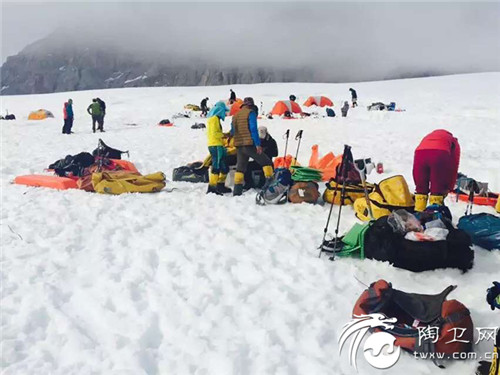 队员们在第三营地整装待发,开始向第四营地进发。从第三营地到第四营地海拔上升了1000米,沿途则需要经历四个陡坡,此外,还要经过有落石的横切面,7、8级风的大风口……而7月3日的暴风雪无疑增大了前行难度。