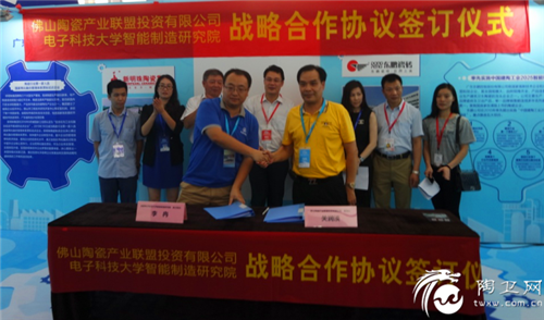 陶卫网讯 记者张敏报道 9月10日,佛山陶瓷产业联盟与成都电子科技大学智能制造研究院在互联网+博览会在佛山市中欧中心正式签约,参加本次签约仪式的有成都电子科技大学智能制造研究院执行院长李冉、佛山市智能产业联盟投资有限公司董事长关润淡、新明珠集团副总经理李重光等24家佛山陶瓷骨干企业以及陶瓷资讯、陶卫网在内的媒体朋友。