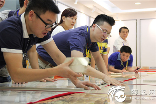 在月度销售会议的最后,亚细亚集团总裁卢伟佳带领业务团队来到新品室进行观摩,并详细介绍了亚细亚新品大理石系列的诸多特质。据卢伟佳介绍,亚细亚本次即将推出的大理石新品系列,运用亚细亚独家研发的喷墨镶嵌技术,依循大理石纹理的走向,360°全方位无死角地精确匹配下陷釉的凹凸效果,彻底告别了鸡爪纹;此外还运用了亚细亚独家的高温釉料技术,让瓷砖发色更加通透,耐磨度、平整度、防污性都上了一个台阶。
