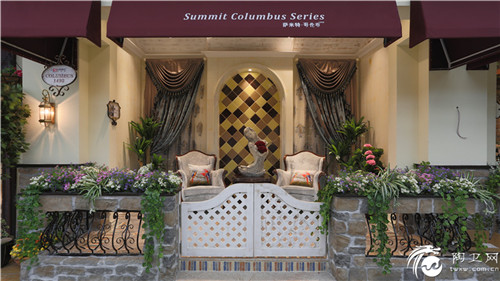 从吧台往右进入就到了斜板展示区,虽然为斜板展示,也很讲究空间风格,看这套田园格调的沙发,犹如进入了美式郊外一家售卖瓷砖的店里,这个推板展示,最大限度的展示了产品,节省了空间。再绕过古堡,回到欧洲大街上,则是一些临街的房屋,有的是客厅临街,有的是窗台临街,还有小花园、餐厅和小睡房,都是还原欧洲家庭临街的真实状态。