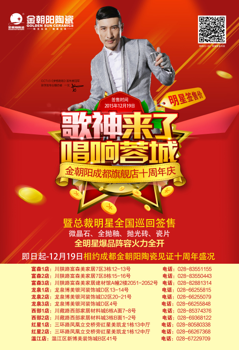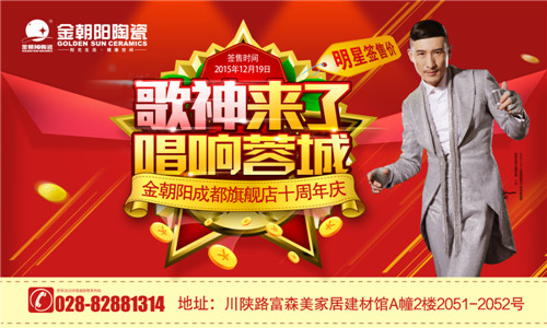 11月5日,“歌神来了”明星总裁大型巡回签售活动已全面启动。从现在起至12月19日,来成都金朝阳陶瓷专卖店,均可享6重阳光礼遇。