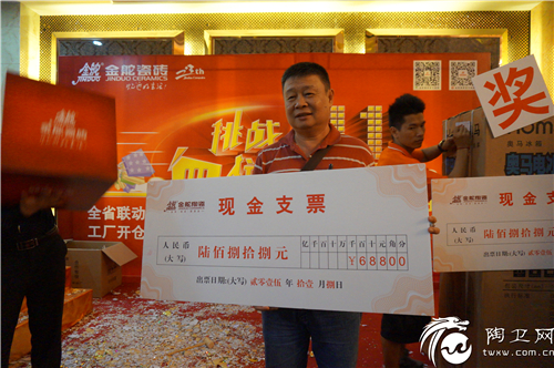 活动最后,是大家期待的抽奖环节。电冰箱、免单668、自行车等大奖一个接一个出现,将整个活动推向高潮;特等奖在最后时间压轴出场,在主持人的邀请下,金舵瓷砖总经理李丹锋上台为获奖业主颁发奖品。该业主激动的与李总握手,接受礼品,并兴奋的表示,“这次能来总部参加团购活动感觉非常幸运,我感受到了金舵的魅力和它的品牌实力,如果还有机会,一定推荐亲朋好友前来选购!”