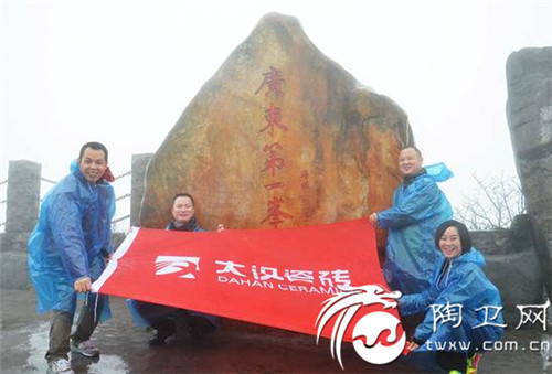 冒着危险,在雨中狂奔,大汉销售精英们无暇顾及身边的美景,一直勇往直前,最终成功登顶,让大汉瓷砖的旗帜,飘扬在广东第一峰的山顶上。