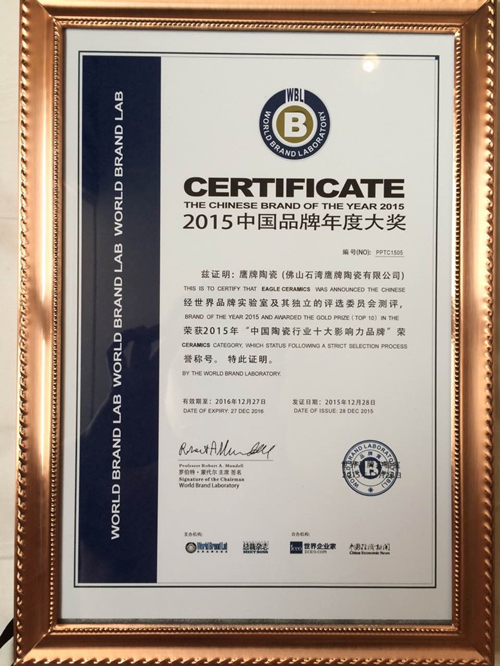 陶卫网讯 12月28日,享有“中国品牌奥斯卡”之称的2015年“中国品牌年度大奖”评选,由业界权威机构世界品牌实验室在北京揭晓颁奖。鹰牌陶瓷凭借创新科技、卓越品质和品牌实力,获赢2015年“中国陶瓷行业十大影响力品牌”荣誉称号。