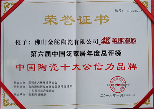 2016年1月7日,金舵瓷砖又添喜讯。由国际建筑装饰室内设计协会主办,美家网承办的第四届中国泛家居领袖品牌论坛暨第六届泛家居十大品牌总评榜在佛山举行。金舵瓷砖作为国内建陶实力品牌的杰出代表勇夺“中国陶瓷十大公信力品牌”荣誉称号,这也是金舵瓷砖继2015年12月31日荣获“互联网家装建材供应商十大推荐品牌”后,不到十天内又获得了一项殊荣。
