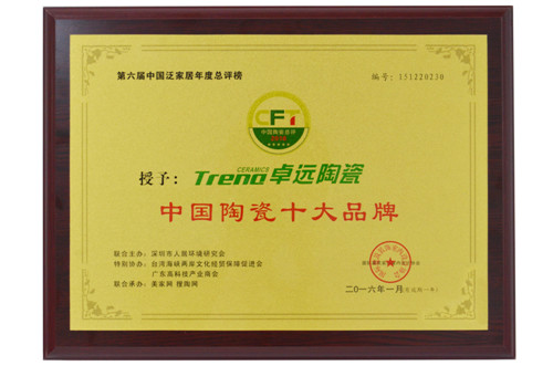 此次,卓远陶瓷荣获“中国陶瓷十大品牌”奖项,可谓实至名归。是行业对卓远陶瓷的肯定和赞许,也是对卓远陶瓷继续保持强劲发展势头,引领行业健康家居发展的信心与鼓励!