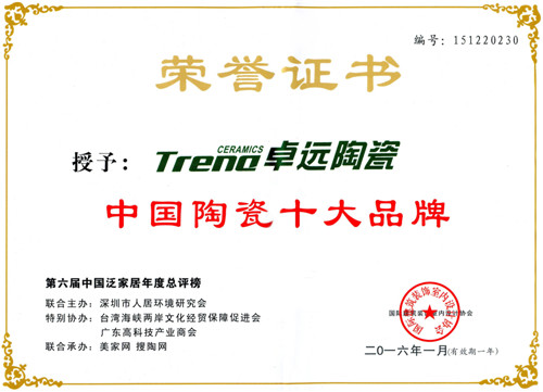 2016年1月7日下午,由国际建筑装饰室内设计协会携手中国国际环境艺术行业协会绿色节能家居建材委员会、台湾海峡两岸文化经贸保障促进会、深圳市人居环境研究会、美家网、搜陶网共同举办的“第四届中国泛家居领袖品牌论坛暨第六届中国泛家居十大品牌总评榜”活动,在广东佛山隆重举行。卓远陶瓷凭借雄厚的企业实力和卓越的品牌口碑,顺利揽获“中国陶瓷十大品牌”奖项。