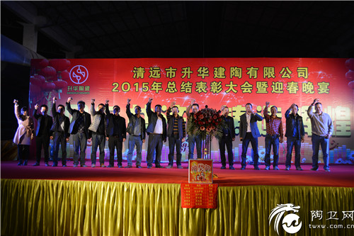 昨晚,2016年1月9日,农历十一月三十,升华陶瓷企业工厂2015年“同舟共济·铸造辉煌”总结表彰大会暨迎春晚宴在广东清远生产基地火热上演,企业董事长何标成、企业总经理张蜜敬、三品牌营销中心各部门人员、清远工厂全体员工等近两千人出席了本次宴会。升华人欢聚一堂,回望2015年努力奋拼的成果,举杯共同祝福升华更加辉煌的明天!