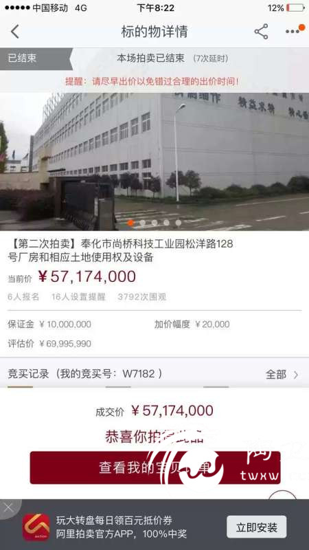 4月26日,“奉化市尚桥科技工业园松洋路128号厂房和相应土地使用权”在浙江省宁波市中级人民法院淘宝网司法拍卖网络平台上被公开拍卖,宁波吉田智能洁具科技有限公司最终以57,174,000 元竞拍成功。