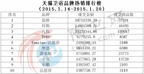 陶卫网讯 2015年1月14日-1月20日,天猫卫浴品牌热销排行榜中,箭牌以成交商品数为57591,成交金额为18711339.39,继续稳居第一;科勒成交商品数为46493,成交金额为14921508.21;九牧以成交商品数为130017,成交金额为13233344.06;TOTO成交商品数为8587,成交金额为6779255.9;Fanzine/法恩莎成交商品数为2188,成交金额为2196309.43;摩恩成交商品数为6380,成交金额为1841430.21;潜水艇成交商品数为25773,成交金额为1750891.27;卡贝成交商品数为13720,成交金额为1477965.28;东鹏成交商品数为2103,成交金额为1392107.42;法恩莎成交商品数为3119,成交金额为1387758.77。