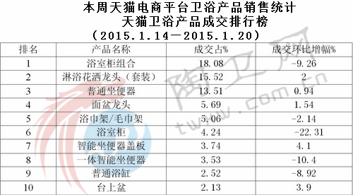 天猫卫浴产品成交排行榜 2015年1月14日-1月20日,天猫卫浴产品成交排行如下:浴室柜组合成交占18.08%,成交环比增幅-9.26%;淋浴花洒龙头(套餐)成交占15.52%,成交环比增幅2%;普通坐便器成交占13.51%,成交环比增幅为0.94%;面盆龙头成交占5.69%,成交环比增幅为1.54%;浴巾架/毛巾架成交占5.06%,成交环比增幅为-2.14%;浴室柜成交占4.24%,成交环比增幅-22.31%;智能坐便器盖板成交占3.74%,成交环比增幅为4.1%;一体智能坐便器成交占3.53%,成交环比增幅-10.4%;普通浴缸成交占2.52%,成交环比增幅-8.92%;台上盆成交占2.13%,成交环比增幅3.9%。