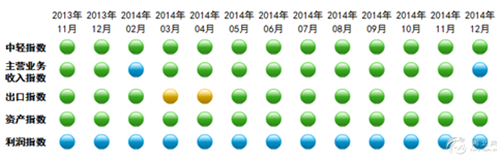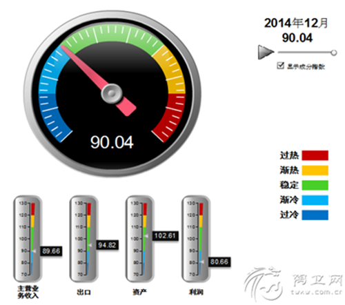 其中:主营业务收入景气指数89.66,出口景气指数94.82,资产景气指数102.61,利润景气指数80.66。其中主营业务收入、利润景气指数跌落至渐冷区间,其他指数位于稳定区间。一年间个指数信号灯变化态势参见图1-2所示。