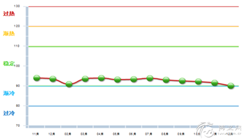 从一年走势情况看,中轻陶瓷景气指数一直运行在稳定区间,但自8月以来呈逐月下降趋势,至12月已处于渐冷区间临界位置,参见图1-3。