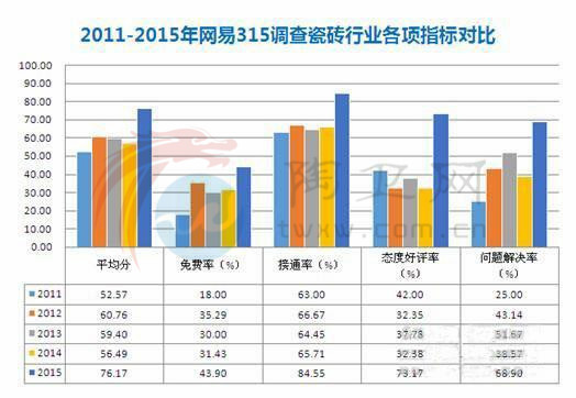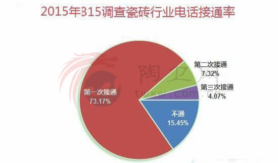 经过一个月的调查,2015年315“家居企业售后服务调查”数据出炉。评分项目从能否方便快捷找到售后服务电话、售后电话是否收费、电话接通率、服务态度、投诉是否能得到专业解决方案这五大方面进行打分。瓷砖企业售后及格率80.49%,在经历了电话售后客服水平连续两年下跌之后,今年整体水平比去年提高了37.63%。对比11大行业综合表现,虽然瓷砖行业售后服务水平并未能排行前列,但其平均分76.17比去年增长19.1分,整体售后服务质量大有提升。