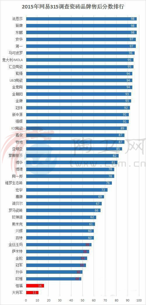 在此次调查的41家瓷砖企业中,八成企业能够在各项指标中取得良好成绩,法恩莎、箭牌、东鹏以98分并列第一,“服务态度”仍是企业最易失分的环节;而在8家不及格企业中,电话不能接通一项让其失分最重,大将军和恒福在多次不同时段的拨打中均无客服接听电话,以11分和16分的总成绩位列最后两名。