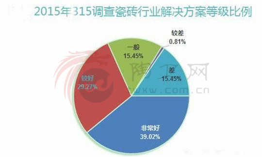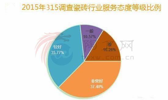 2015年315调查最终数据显示,瓷砖企业服务态度好评率为73.17%,比去年上涨40.79%,在五项指标中涨幅最高,可见企业们确实有在客服态度上下功夫;而16.26%的差评率来自客服将问题直接推给经销商解决、未能提供较为妥善的解决方案以及敷衍的态度和急躁的语气等不良表现。