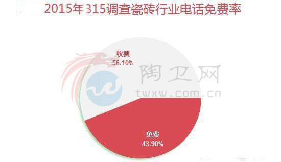 今年调查中,瓷砖行业售后电话免费率43.9%,过半企业售后电话仍需收费,在11个行业中收费率最高,连意大利IMOLA、能强、金朝阳等三家高分企业都在收费之列,与去年相比,虽然瓷砖行业售后电话免费率上升了12.47%,上升幅度在行业中排名第二,但瓷砖企业对电话售后仍需加大重视。