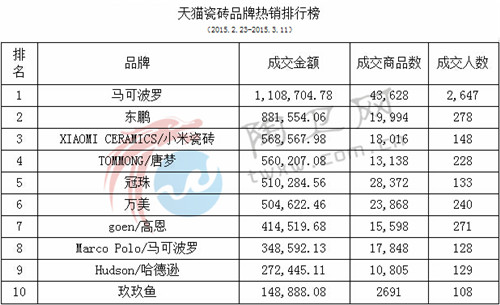陶卫网讯 记者庞杏华报道 本周(2.23-3.11)天猫瓷砖品牌热销榜中各品牌的成交金额比上周有明显上升,其中前十位分别有马可波罗、东鹏、XIAOMI CERAMICS/小米瓷砖、TOMMNG/唐梦、冠珠、万美、goen/高恩、Marco Polo/马可波罗、Hudson/哈德逊、玖玖鱼。上周冠军Hudson/哈德逊成交金额272,445.11下降至第九位,而马可波罗则以1,108,704.78的成交金额跃居第一,比亚、季军品牌的成交金额分别高出约22万和54万。