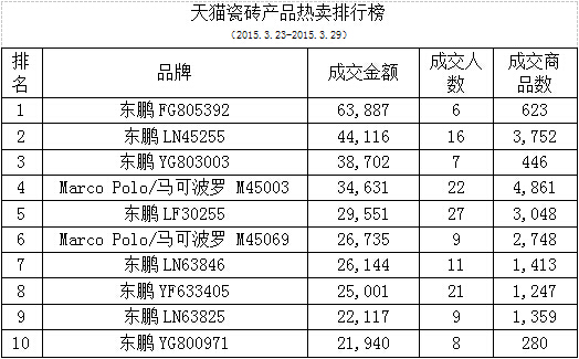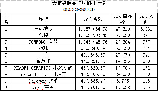 3月23日到3月29日天猫瓷砖品牌热销榜中各品牌的成交金额有所回落,其中前十位分别有马可波罗、东鹏、TOMMONG/唐梦、冠珠、万美、金意陶、XIAOMI CERAMICS/小米瓷砖、Marco Polo/马可波罗、Oapower/欧柏、goen/高恩。本周马可波罗瓷砖以成交金额多出第二名品牌8万优势抢占榜首。